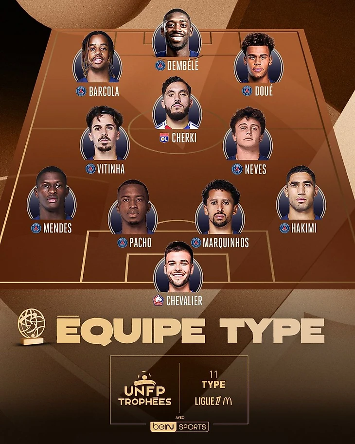 Команда сезона состоит из игроков «ПСЖ», а также Матиса Шерки из «Лиона» и Люки Шевалье из «Лилля», который и забрал награду лучшему голкиперу.