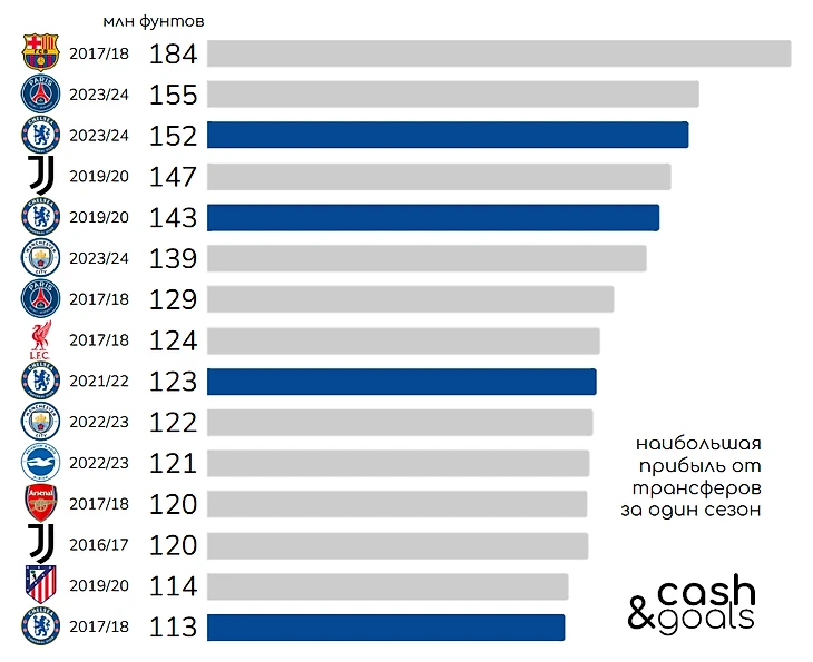 Челси обновил исторический рекорд АПЛ по прибыли от трансферов в одном сезоне - 152,5 млн! Предыдущий принадлежал тоже Челси: в сезоне 2019/20 прибыль составила 143 млн. Впрочем, клуб так хорошо прокачал свою академию и так активно ведет себя на трансферном рынке, что в топ10 по величине прибыли от трансферов за сезон синие попадают 4 раза (в сезонах 2023/24, 2019/20, 2021/22 и 2017/18). Во всех случаях прибыль превышала 100 млн.