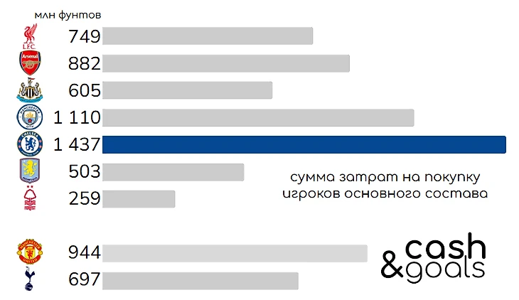 Официально (УЕФА подтверждает) на 30 июня 2024 года Челси располагал самым дорогим составом за всю историю европейского футбола! И речь здесь не про оценку игроков от transfermarkt, football benchmark или аналогичных порталов, а про сумму первоначальных затрат на покупку игроков основного состава. 1 436 669 фунтов - сумма нового рекорда. Предыдущий рекорд принадлежал мадридскому Реалу, состав которого на конец сезона 2019/20 стоил 1,332 млрд евро или около 1,170 млрд фунтов. Для наглядности предлагаю сравнить затраты на состав всех клубов, ведущих борьбу за место в Лиге чемпионов (т.к. победитель Лиги Европы получает место в Лиге чемпионов, условно добавим в список и Манчестер Юнайтед с Тоттенхэмом).
