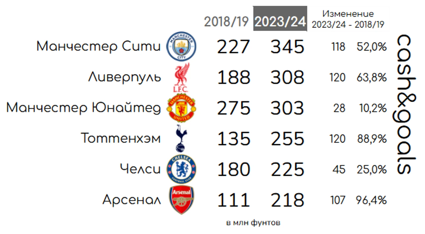 Уровень коммерческих доходов определяет своего рода финансовый водораздел между большой шестеркой и остальными клубами АПЛ. Седьмой клуб по данному показателю (Ньюкасл, 86 млн) в 2,5 раза уступает шестому (Арсенал, 218 млн). Но и шестерка неоднородна. Десять лет назад коммерческие доходы Тоттенхэма уступали Челси почти в 2 раза, в последнем доковидном сезоне (2018/19) по уровню дохода клубы можно было условно разделить на 3 пары: Манчестер Юнайтед - Манчестер Сити (200+ млн), Ливерпуль - Челси (188-180 млн), Тоттенхэм - Арсенал (135-111 млн). За последние 5 лет ситуация сильно изменилась: Ман Сити и Ливерпуль догнали и обогнали Манчестер Юнайтед, Тоттенхэм опередил Челси, Арсенал приблизился вплотную.