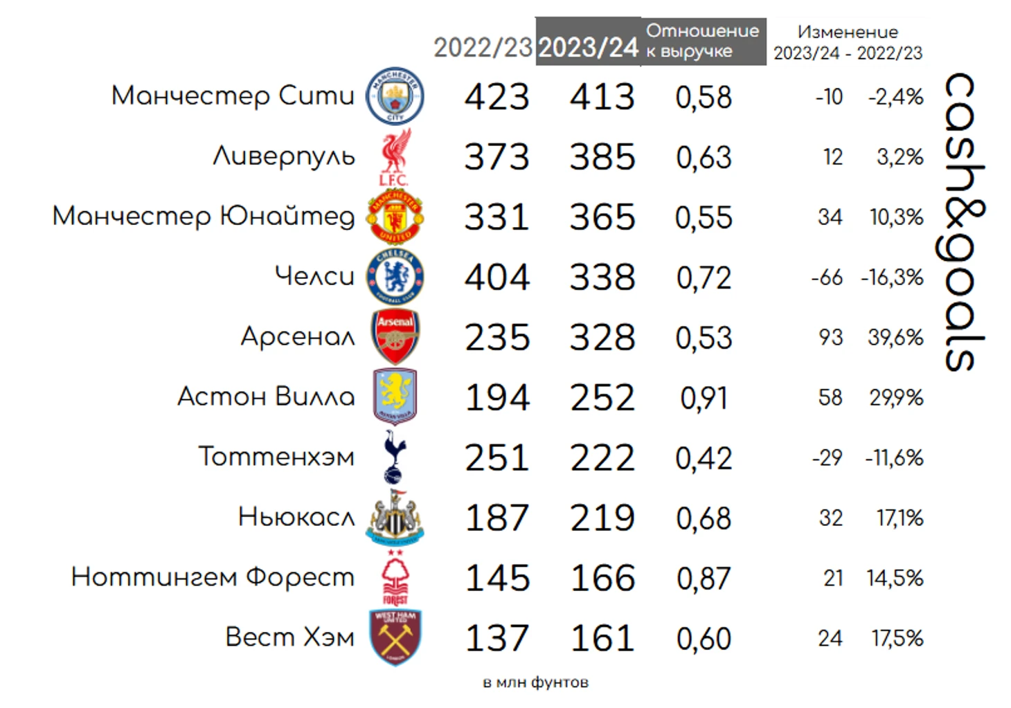 Есть и очевидный позитив: клуб сделал шаги в нужном направлении и подрезал операционные расходы через сокращение заработной платы. Сразу на 66 млн! Отношение заработной платы к выручке снизилось с 0,79 до 0,72. Такое снижение позволило опустить в рейтинге АПЛ по расходам на заработную плату со 2-го на 4-е место. Судя по новостям из клуба, работа по оптимизации фонда оплаты труда будет продолжаться и дальше.