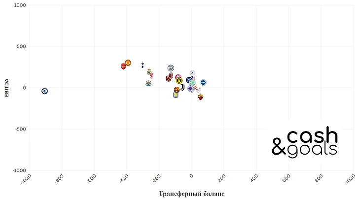 клубы, у которых в минусе и трансферный баланс, и операционная деятельность. Левый нижний прямоугольник. Барселона и Астон Вилла. Челси здесь можно вынести в отдельную подгруппу, т.к. трансферный баланс в таком глубоком минусе, что даже масштаб графика пострадал.