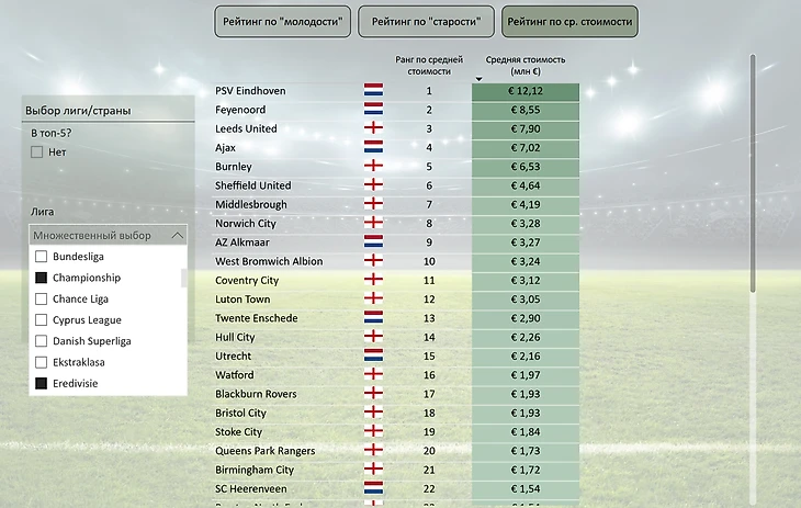 На дашбордах представлены данные по всем командам Европы из высших лиг или с общей стоимостью игроков более 10 млн евро (данные transfermarkt). Каждый заинтересованный может составлять рейтинги или сранивать команды по среднему возрасту и стоимости игроков. На панелях слева функционал выбора лиги или страны: можно выбирать сразу несколько любых лиг/стран при зажатии клавиши Ctrl. Для примера снизу скрин общего рейтинга команд Чемпионшипа и Эредивизи по средней стоимости игроков (первое что попалось под руку).