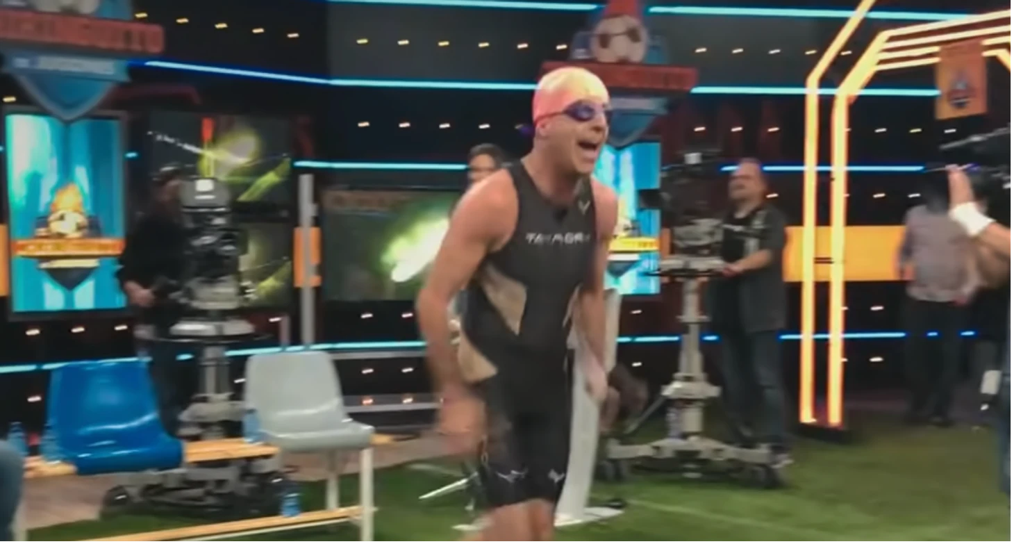 А вот один из примеров жесткого стеба. В эфире испанского канала El Chiringuito мужик в образе триатлониста носится по студии и имитирует, как Винисиус бегает, крутит педали, а потом ныряет.