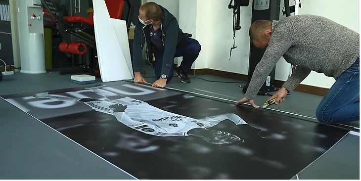 А здесь рабочие в спортзале готовятся вешать на стену большое фото Вини.