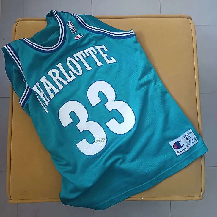 Это джерси Алонзо Моурнинга времени яркого дебюта в НБА. Немногие вспомнят, что один из самых трушных центров лиги начинал в очень ярком «Хорнетс» начала 90-х. Уже потом будет «Майами», титул и абсолютно заслуженная легендарность.