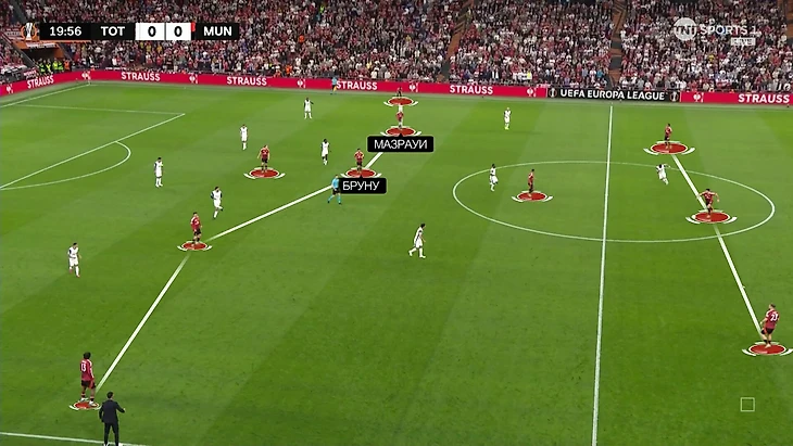 В первой половине «Юнайтед» атаковал в структуре 3-1-5-1. Бруну сразу поднимался в чужую опорную, Нуссаир Мазрауи тоже смещался туда, а Амад и Доргу занимали максимально высокие позиции на флангах.
