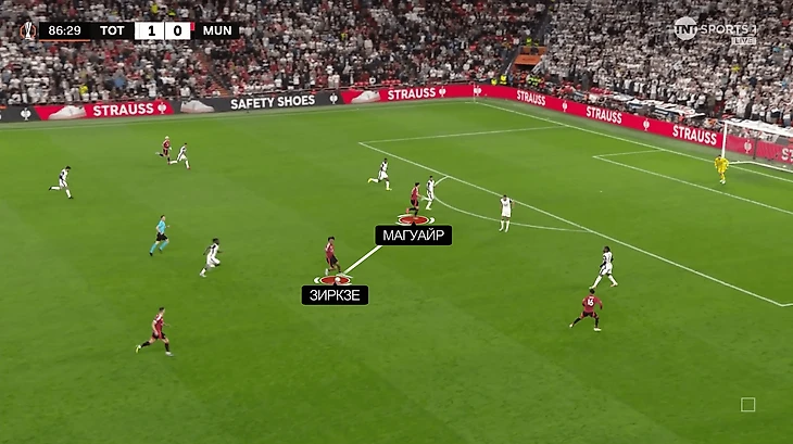 Далее ход Аморима. Чтобы поддержать Зиркзе, португалец отправил в нападение Магуайра. Не самый редкий ход для «МЮ» в последнее время, а тут еще и актуальный, учитывая перестановку Постекоглу.