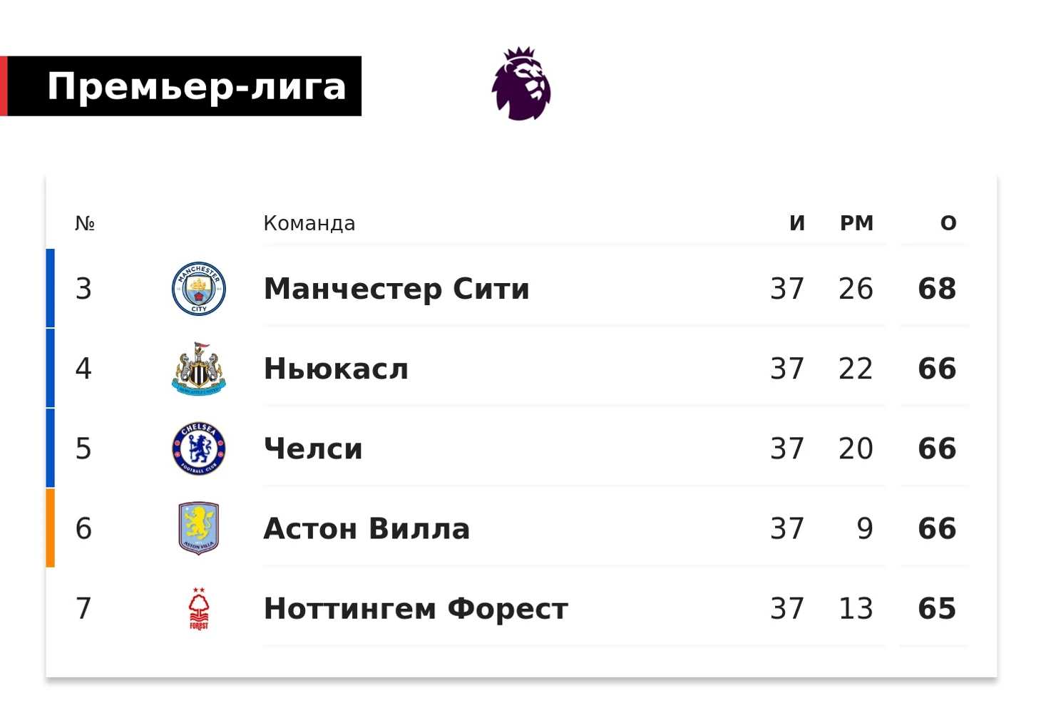 Перед решающим днем лондонцы пятые с 66 очками. Столько же у «Ньюкасла» и «Астон Виллы»: команда Эдди Хау незначительно превосходит «Челси» по разнице мячей (+22 против +20), бирмингемцы – заметно уступают (+9). «Манчестер Сити» с 68 баллами занимает третью строчку.