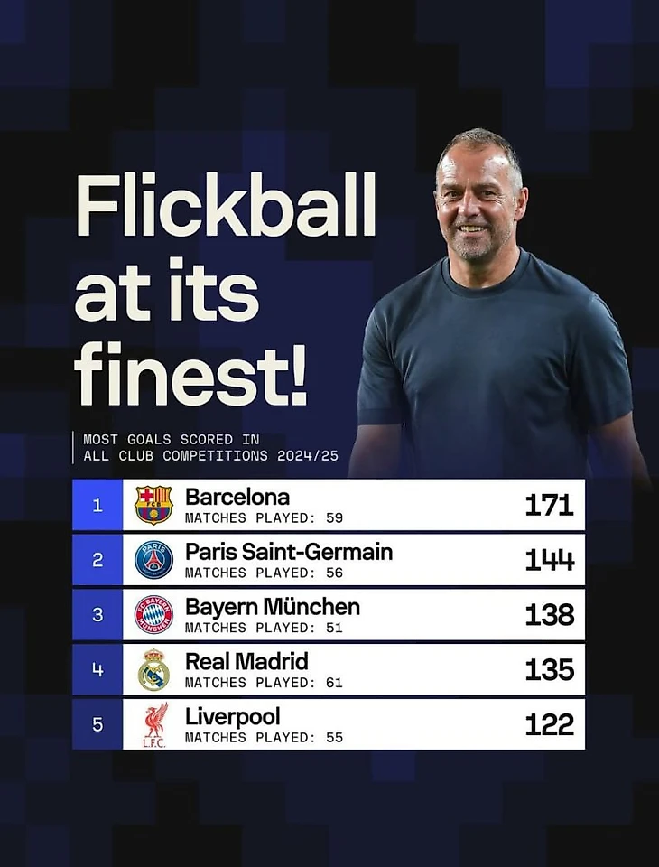 Лидером оказалась «Барселона» Ханси Флика. За 59 матчей во всех соревнованиях каталонцы забили 171 гол – на 27 мячей больше, чем «ПСЖ», который провел на три встречи меньше и занял вторую строчку рейтинга.
