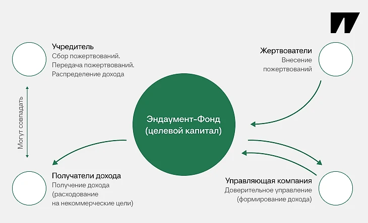 Важное отличие от других видов социального финансирования: основные средства эндаумента не расходуется получателем, а передаются в доверительное управление профессиональной компании, которая их инвестирует в определенные виды активов – ценные бумаги, депозиты или недвижимость.