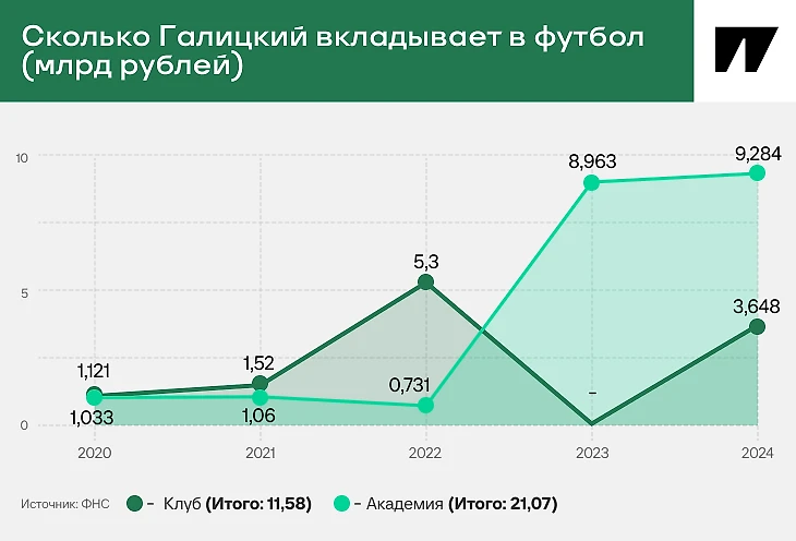 С учетом денежных вкладов в головной клуб (3,65 млрд рублей) прямые и косвенные добровольные вклады Галицкого в краснодарский футбол в 2024 году составили 11,4 млрд рублей.