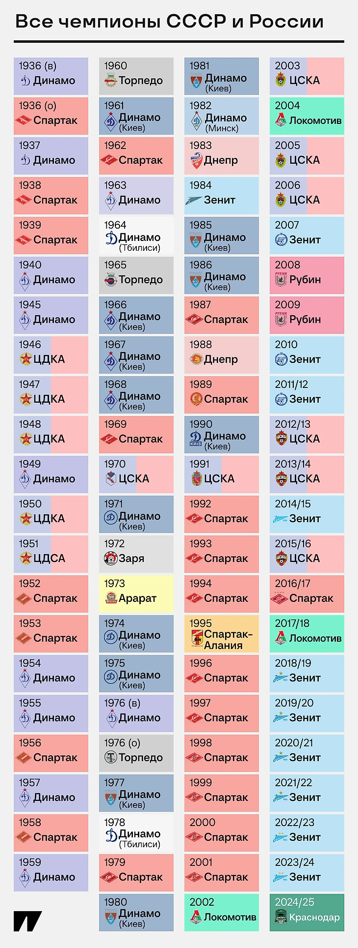 ⭐️ «Спартак» – самый титулованный клуб в объединенном рейтинге. 12 раз брали чемпионат СССР, еще 10 чемпионств – в российской истории. Правда, последнее золото осталось еще в 2017-м.