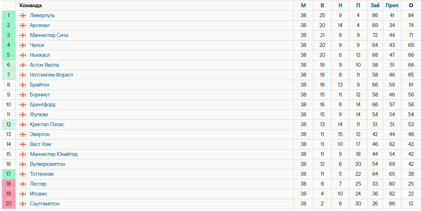 Напомним, как выглядит итоговая таблица АПЛ сезона-2024/25, чтобы понимать, что в принципе фанаты той или иной команды считают за успех.