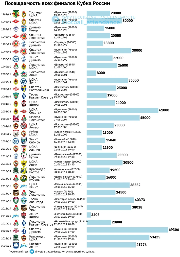 Напомню, посещаемость всех матчей всех российских турниров можно оперативно смотреть в канале «Футбольная посещаемость». А ниже — ретроспектива всех финалов в истории Кубка.