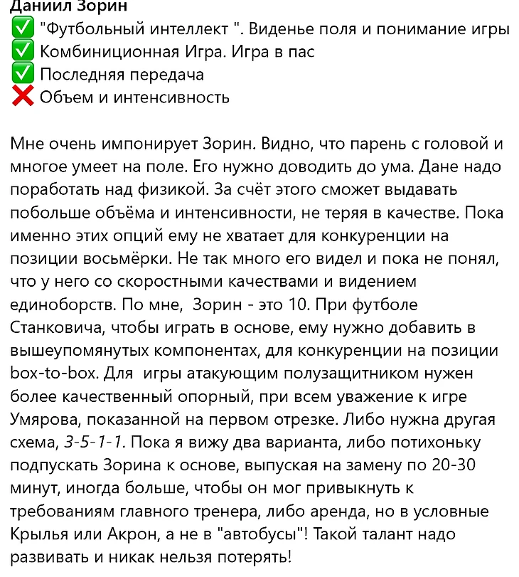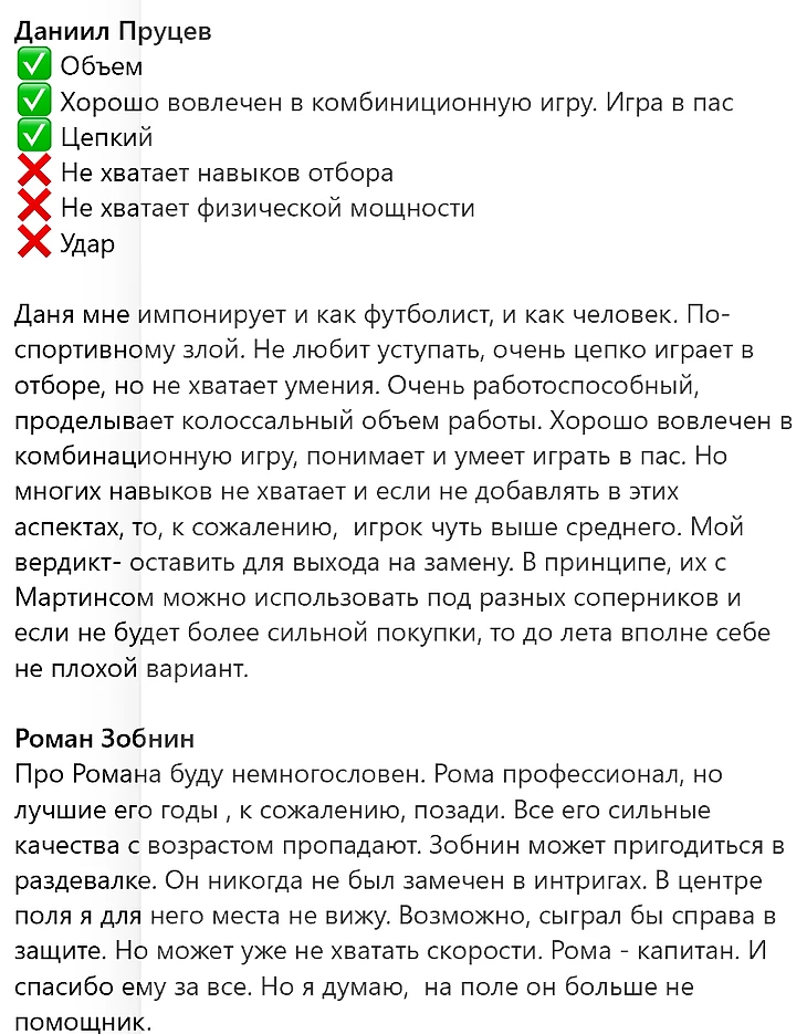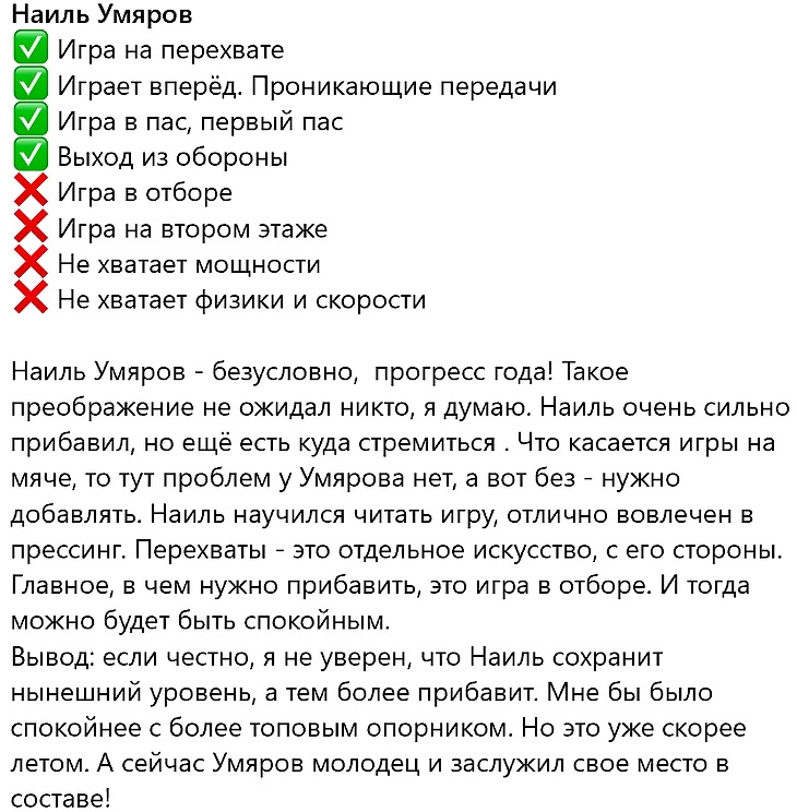 По Руслану меняю оценку на негативную. Литвинов откровенно разочаровал: все присущие ему качества как сильные, так и слабые остались при нём, но я ждал прогресса, а Литвинов, видимо, ждет маны небесной, иначе я не могу объяснить, почему не самый глупый парень не работает над элементарными аспектами. В отличие от Пруцева, даю ему ещё полгода на работу над собой, ведь Умярова смогли превратить в футболиста.