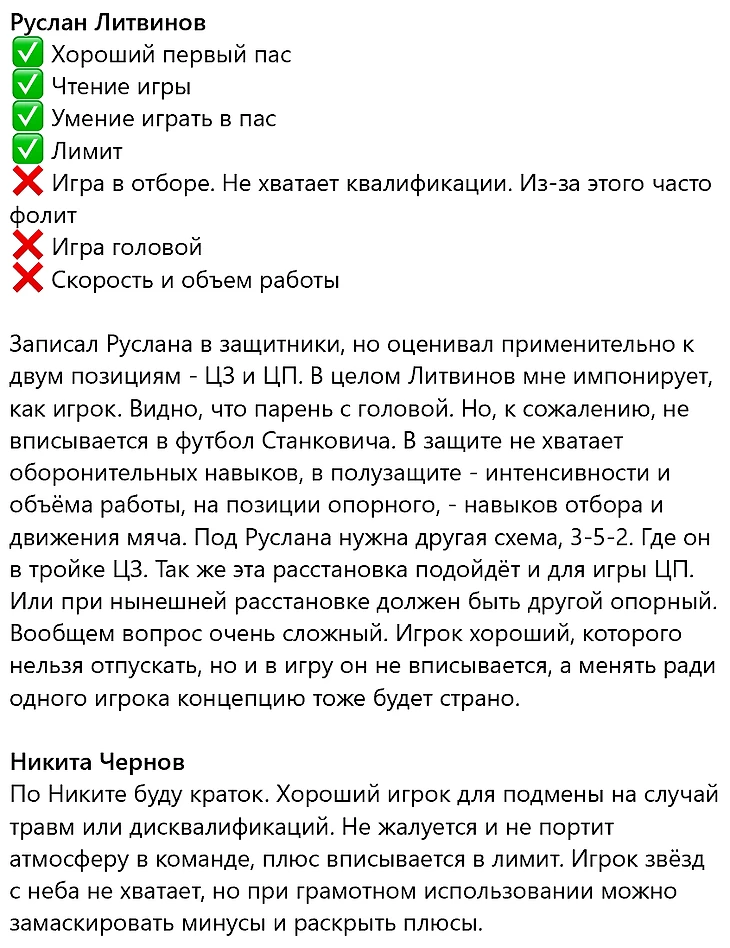 Остаются Умяров в основной состав, возможно Чернов, если мы вдруг решим делать лимитную позицию в центре обороны. Если нет, то Никита всё равно хорошо подойдёт для выхода на замену. А также Литвинов для ротации, Руслану, конечно, надо прибавлять во многих компонентах, и молодой Массалыга, которого мне понравился по тем эпизодам, которые видел с ним. Станковичу, кстати, минус за то, что не доверяет молодёжи!