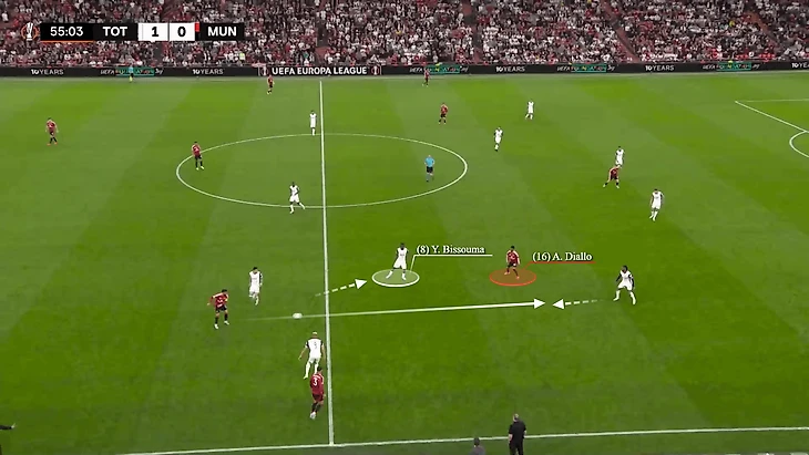 В игре с «ТТХ» был показательный момент: на 56-й минуте Йоро отдает пас Мазрауи, а Фернандеша окружают три игрока. Аморим (внизу слева) указывает Амаду продвинуться дальше в поле, в пространство между Дестини Удоджи и Микки ван де Веном.