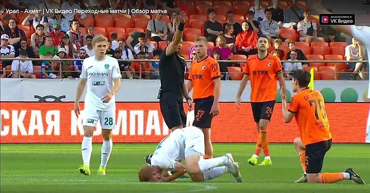 Подкат на игрока Урала, после которого игрок лежит на земле? Не повод останавливать игру. ЧтО?! Игрок Урала играл в мяч и игрок Ахмата упал в этот момент?! КРАСНАЯ КАРТОЧКА!!