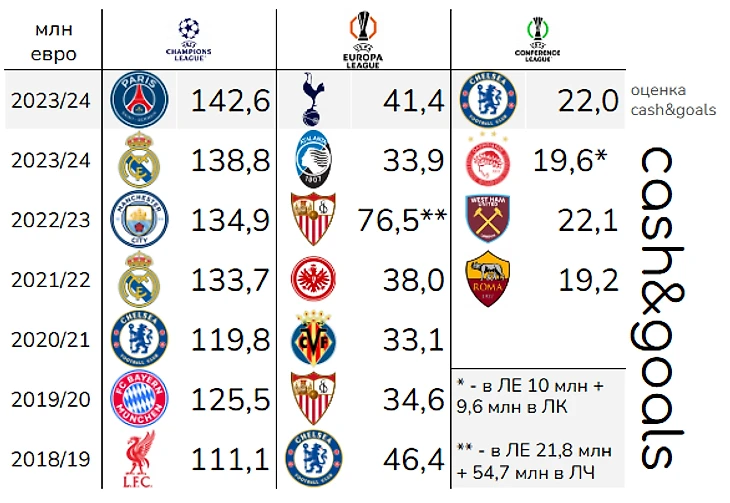 Сразу 8 клубов за евросезон заработали больше 100 млн, такого еще не было. В прошлом сезоне столько заработали 5 клубов (все участники полуфиналов + Манчестер Сити).