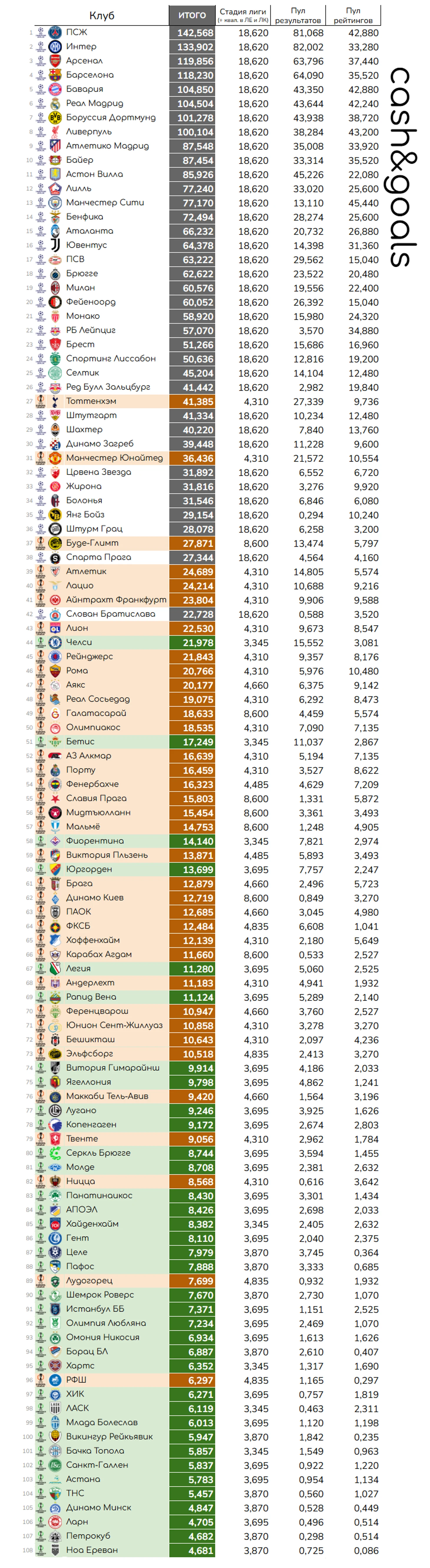 Важно! Все приведенные ниже расчеты составлены автором на основании данных официального циркуляра УЕФА (Distribution to clubs from the UEFA Champions League, UEFA Europa League, UEFA Conference League and the UEFA Super Cup for the 2024–27 cycle). Т.к. данные о суммах ТВ контрактов с национальными вещателями неизвестны, рейтинг ТВ прав составлен расчетно на основании информации о выплатах клубам разных стран по статье Marketing pool в предыдущих сезонах.
