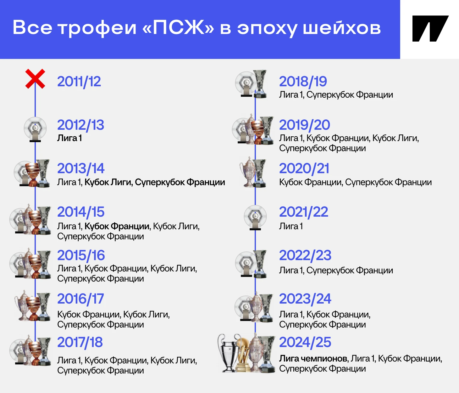 🏆 Катарские шейхи купили «Пари Сен-Жермен» летом 2011-го. Под руководством ближевосточных владельцев клуб уже 14 сезонов и за это время выиграл 11 чемпионатов Франции, восемь Кубков Франции, шесть Кубков французской лиги и 11 Суперкубков страны. Теперь в коллекции есть и долгожданная Лига чемпионов.