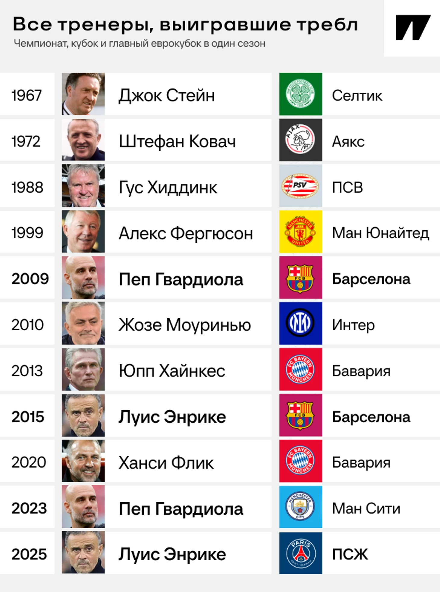 Вот список великих тренеров, оформивших требл. Луис Энрике в нем уже второй раз.