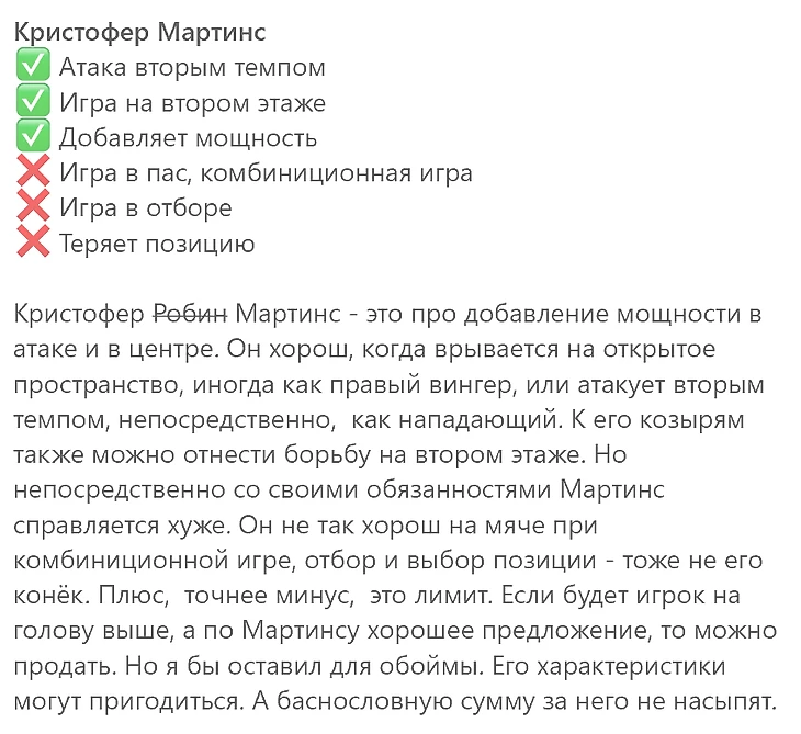 Кристофер Мартинс — идеальный джокер или тот, кто способен делать разницу? Именно с таким заголовком у меня скоро выйдет пост. А по существу, весной Мартинс показал лицом свои сильные качества, но слабые от него никуда не делись. В схеме 4-3-3 на роль правой восьмёрки не подходит уровнем, но хорошо может выходить на замену, а более подробно расскажу в отдельной статье. По мне, дорого мы люксембуржца не продадим, поэтому такая корова нужна самому!