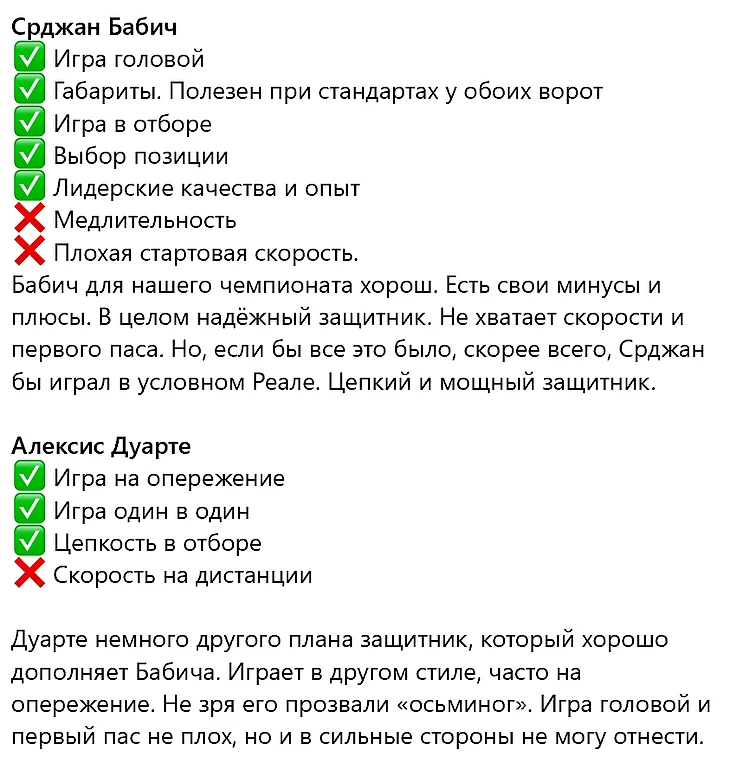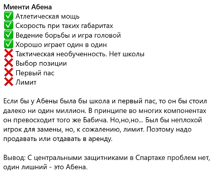 Матиас Абена: Вот все смеются над Абеной, а он во многих компонентах превосходит того же Бабича. Беда в том, что нет тактической выученности и первого паса. Из минусов также — то, что занимает легионерскую позицию. Можно оставить для замены. Расставаться только при том, что надо будет освободить место для более стоящего игрока.