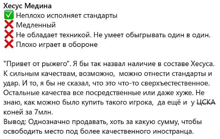 Хесус Медина: про парагвайца можно сказать — это не рыба, не мясо. Я вообще не понимаю, как его можно было купить за 7 млн €. Как можно быть вингером и не иметь ни скорости, ни техники? На что расчёт? Если бы за него можно было выручить хотя бы какие-то деньги, но у меня на этот счёт большие сомнения. Скорее всего, очередной разрыв контракта или аренда с выплатой части зарплаты.