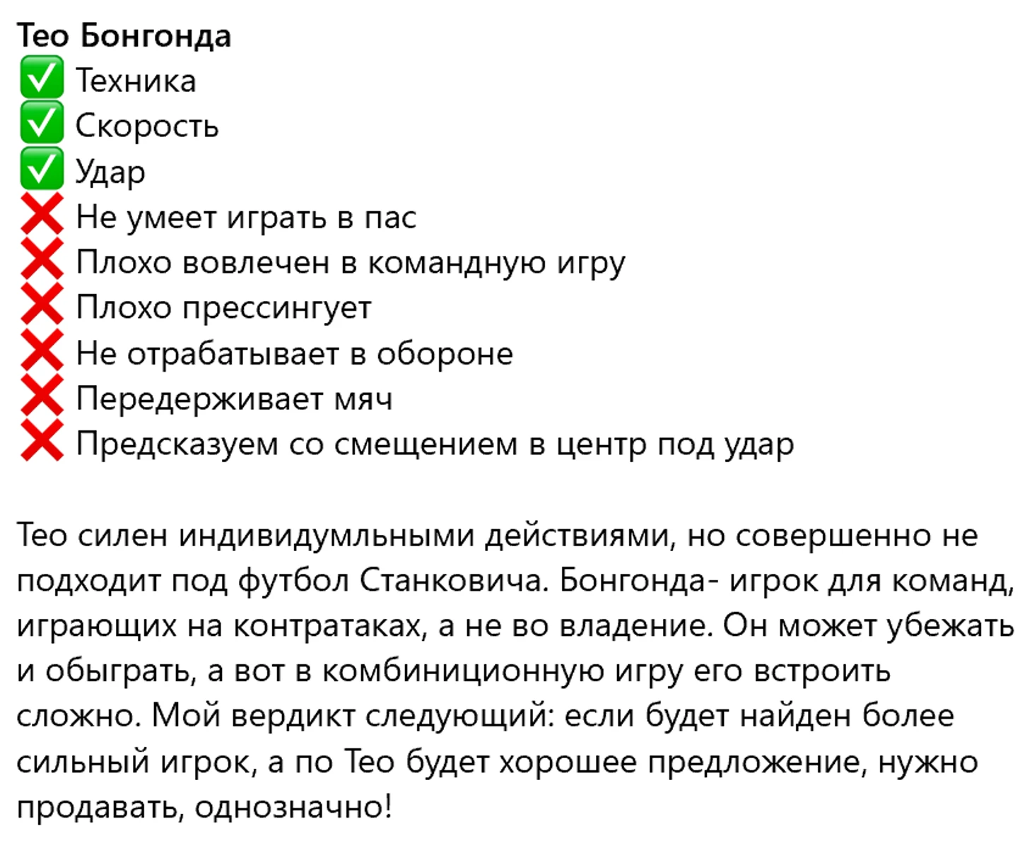Тео Бонгонда: Бонгонда не вписывается в игру от слова совсем. Иногда может взорваться и сделать разницу, но даже его технический арсенал достаточно скуп и предсказуем. Если будет предложение — продавать.