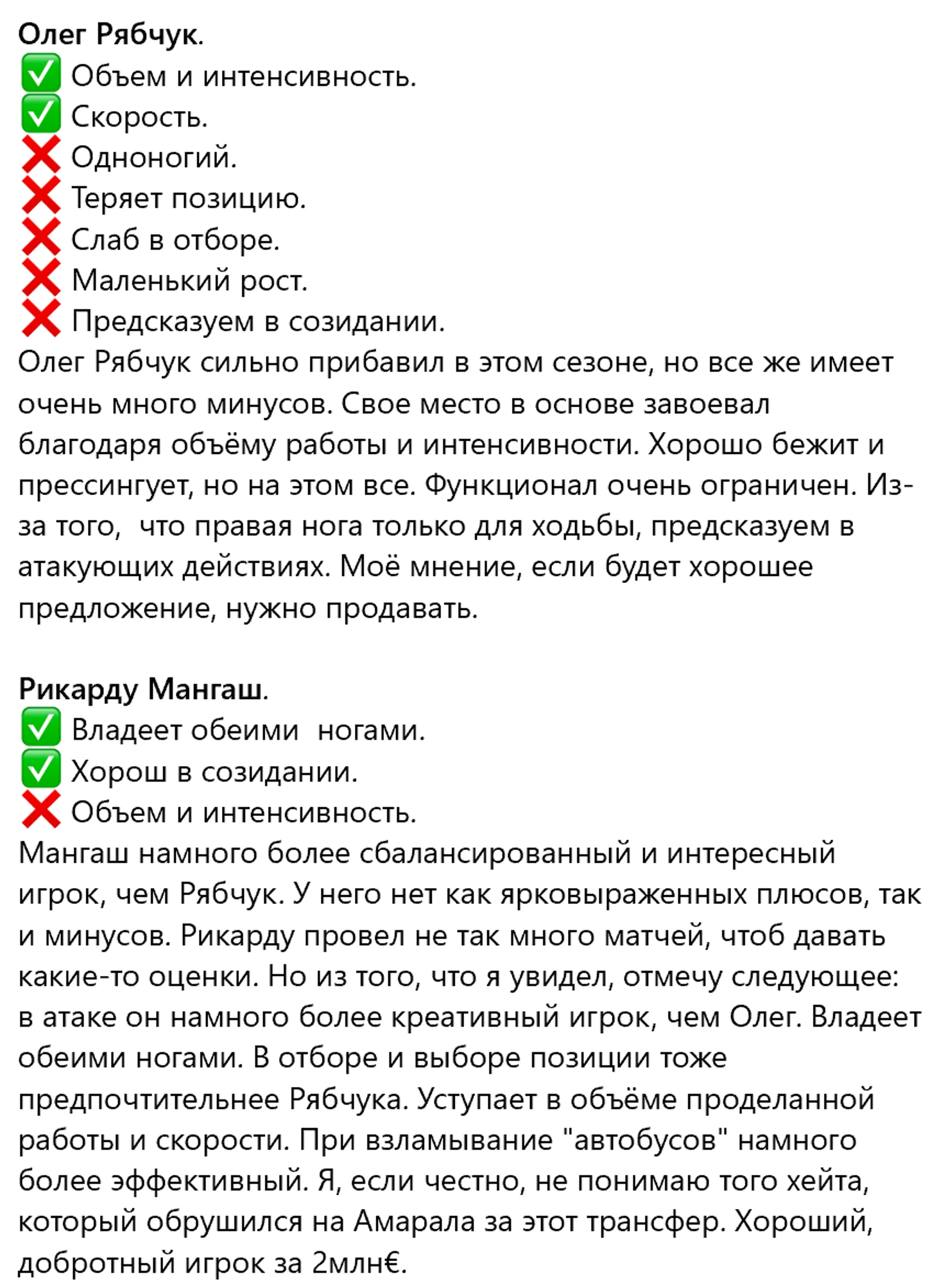 Рикардо Мангаш: а вот португалец мне импонирует! Цена–качество. Не знаю, что там у Станка не сложилось с Рикардо, но Мангаш уступает Рябе только в интенсивности и объёме. На много интереснее в атаке, да и в защите — лучше, хотя бытует обратное мнение, но я не знаю, кто и с чего это взял? То, что видел я — Мангаш намного сильнее молдаванина и в нападении, и в защите. Хотелось бы легионера более высокого класса, но я бы дал шанс португальцу, тем более — дорого его не продать.