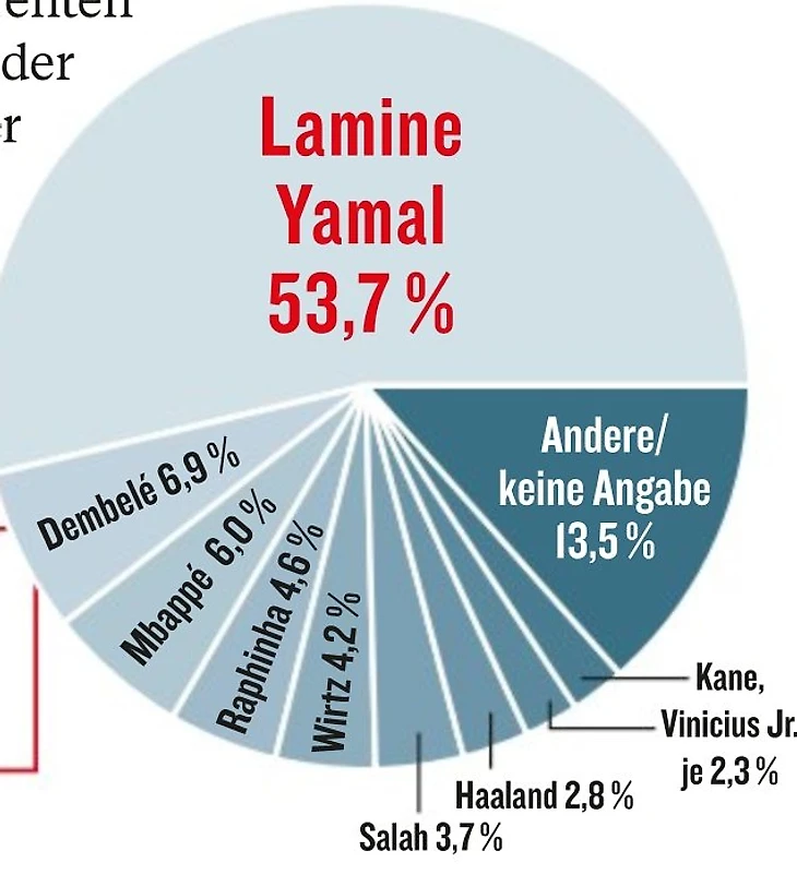 Лучший атакующий игрок Европы − Ламин Ямаль из «Барселоны» (53,7%). Огромное преимущество над Усманом Дембеле («ПСЖ», 6,9%) и Килианом Мбаппе («Мадрид», 6%). Вы тоже удивлены, что лучший игрок сезона АПЛ Мо Салах только шестой?