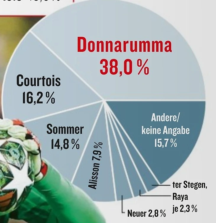 При выборе лучшего вратаря футболисты Бундеслиги довольно сильно прокатили своих. Первое место с отрывом у победителя Лиги чемпионов Джанлуиджи Доннаруммы из «ПСЖ» − 38%. Следом идут Тибо Куртуа («Мадрид», 16,2%) и Янн Зоммер («Интер», 14,8%).