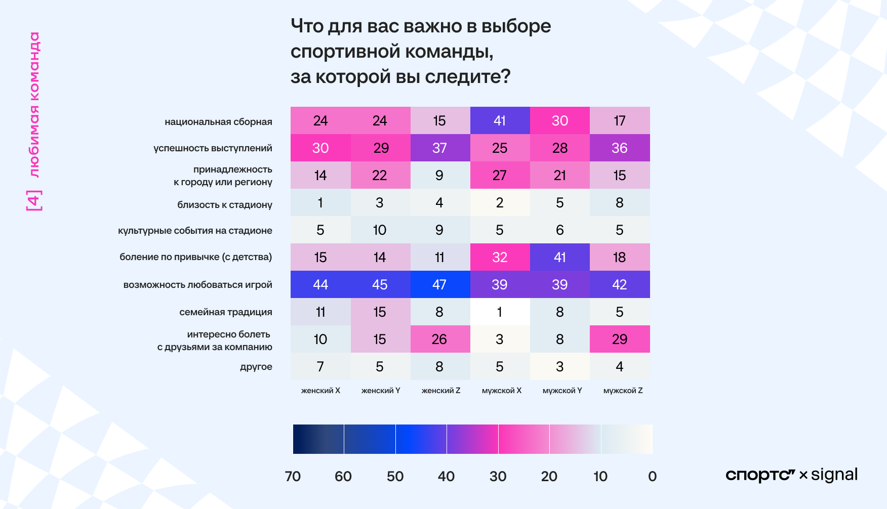 Кстати, поэтому же причиной, почему начали болеть за конкретную команду, чаще становится что-то вроде «случайно оказался на матче за компанию» – такой паттерн нехарактерен для старшего поколения, но регулярно встречается у молодой аудитории.