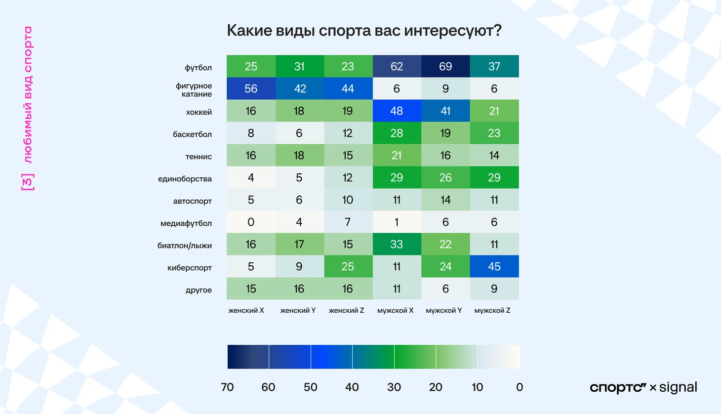 Да и вообще герои могут быть непривычными для многих, ведь по поколениям интерес к классике – футболу и хоккею – снижается. Например, 37% мужчин-зумеров следят за футболом, 21% – за хоккеем. Зато четверть женской и половина мужской аудитории поколения Z интересуются киберспортом.