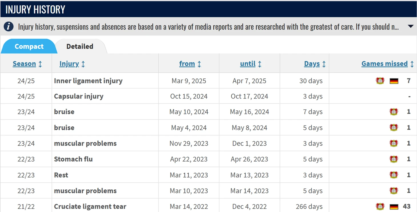 При всём этом многие смотрят с опаской на историю травм Флориана Виртца. Травма крестообразной связки в 2022 году и мелкие повреждения в 2024/2025 вызывают вопросы о его устойчивости. Однако здесь спешим вас успокоить: с момента возвращения после злосчастной травмы Фло выбыл на срок более, чем 1 матч лишь однажды – в прошедшем сезоне он отсутствовал 7 матчей из-за повреждения голеностопа.