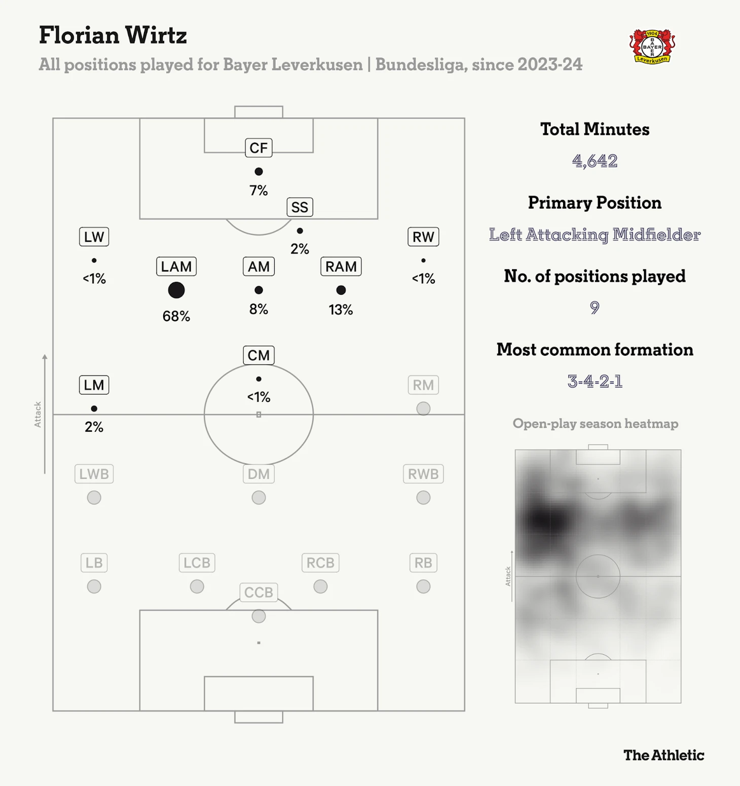 В «Байере» под руководством Хаби Алонсо Виртц стал центральной фигурой в схеме 3-4-2-1, действуя в качестве левой десятки. Он отвечает за создание моментов и связь между полузащитой и атакой, привлекая к себе внимание защитников и создавая пространство для партнеров.