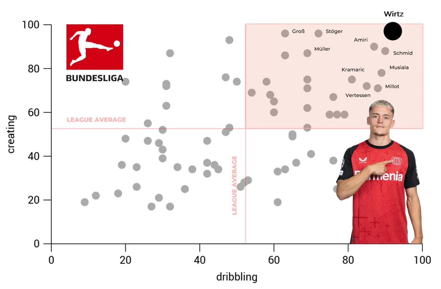 Если проанализировать лучших полузащитников лиги с точки зрения дриблинга и креативности, Виртц и здесь окажется в правом верхнем углу графика.