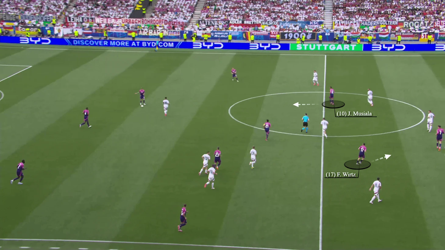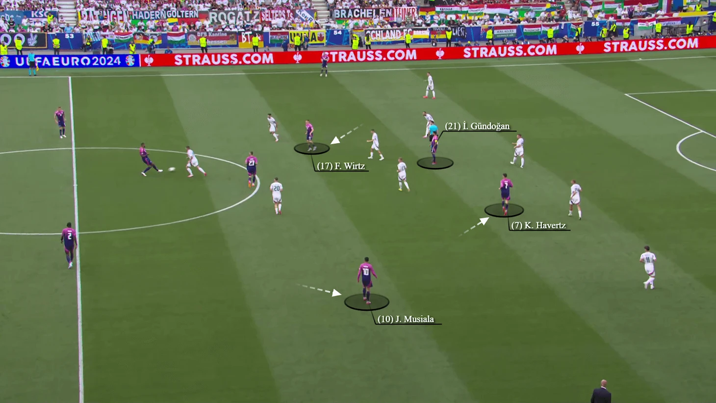 В этом примере, в матче группового этапа Евро-24 против Венгрии, Виртц отходит назад, чтобы получить мяч от своих защитников. По мере того как Венгрия движется к нему, Мусиала смещается шире, а Хаверц и Гюндоган занимают позиции напротив центральных защитников.