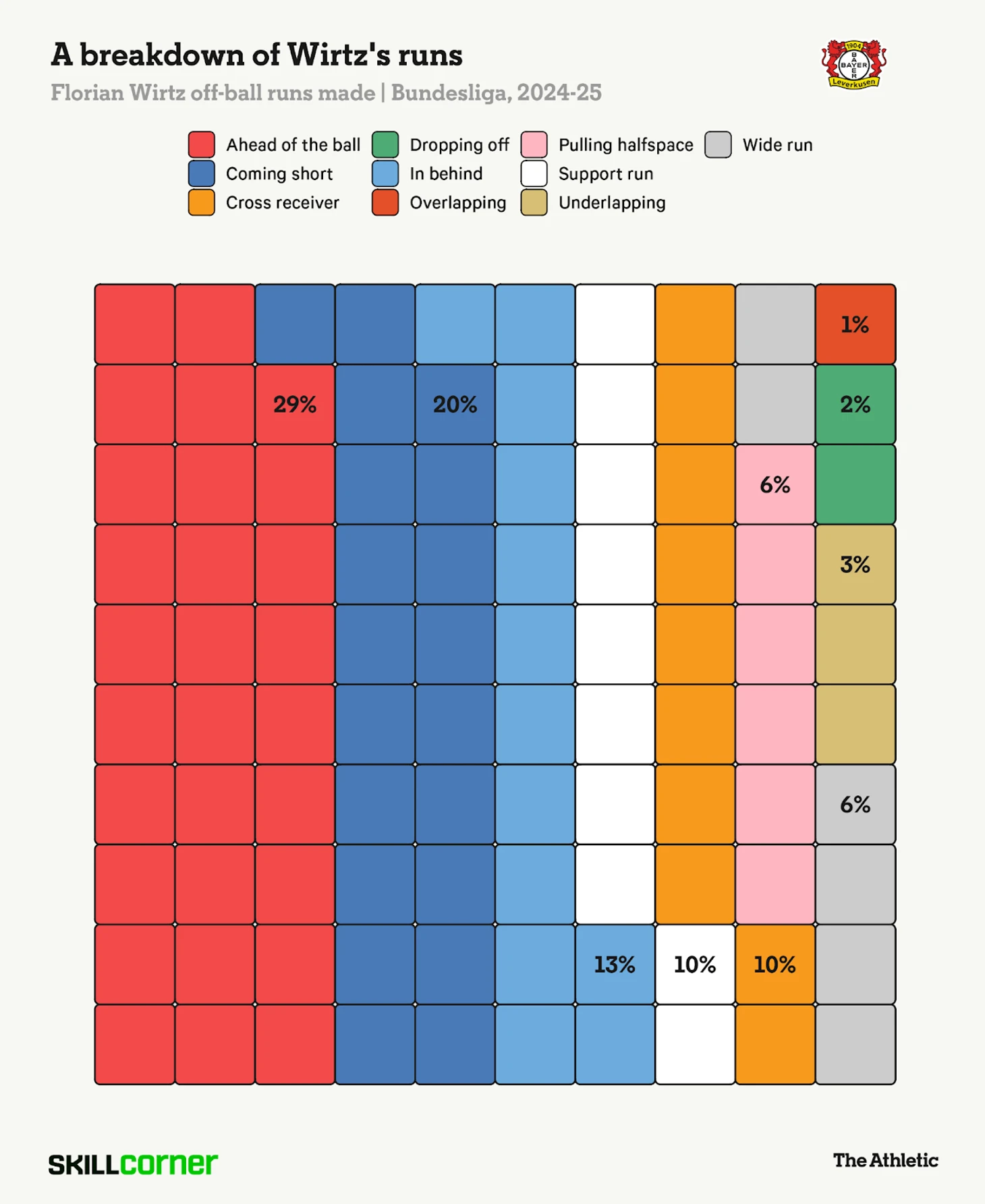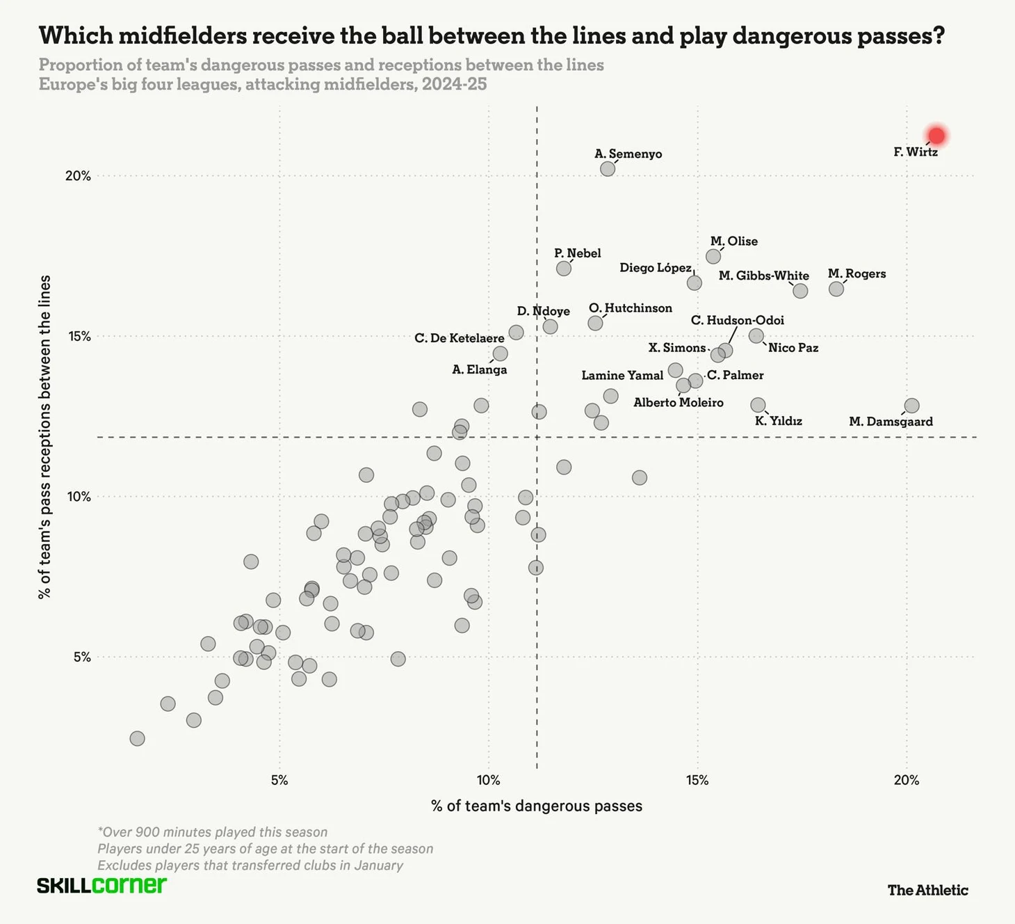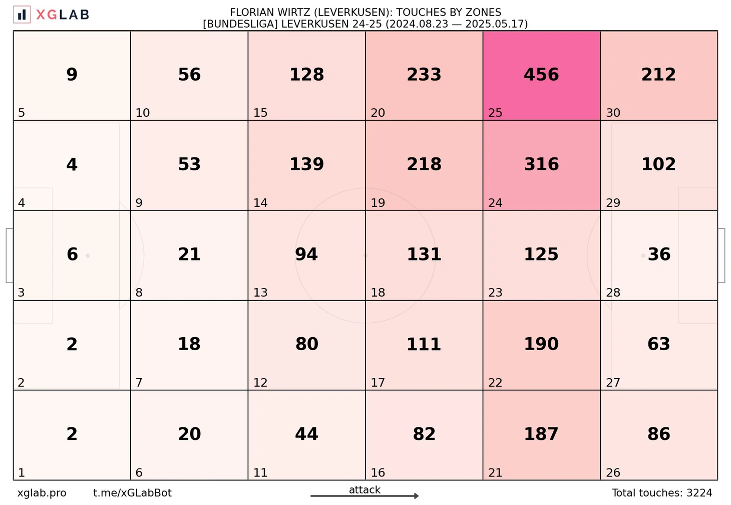 Виртц занял восьмое место по количеству прогрессивных передач в Бундеслиге в этом сезоне (155) – это пасы, выполненные с игры в атакующей трети поля, которые приблизили мяч к воротам как минимум на 25%. Он также занял третье место по количеству полученных прогрессивных передач (232), что на 57 больше, чем у любого из семи игроков, которые входят в упомянутую восьмерку.