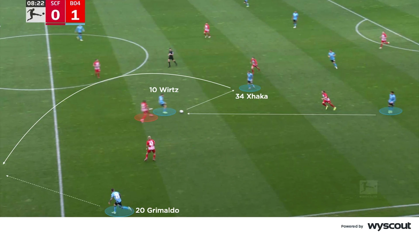 Это можно увидеть ниже, где Виртц опустился и получил прямой пас под давлением. Он стянул на себя правого защитника «Фрайбурга» и отдал пас в касание на Гранита Джаку. Этот пас является триггером – Гримальдо делает рывок, чтобы использовать пространство позади оппонента, создавая возможность для опасной атаки. Аналогичные ситуации часто возникали и на противоположном фланге во взаимодействии с Джереми Фримпонгом.
