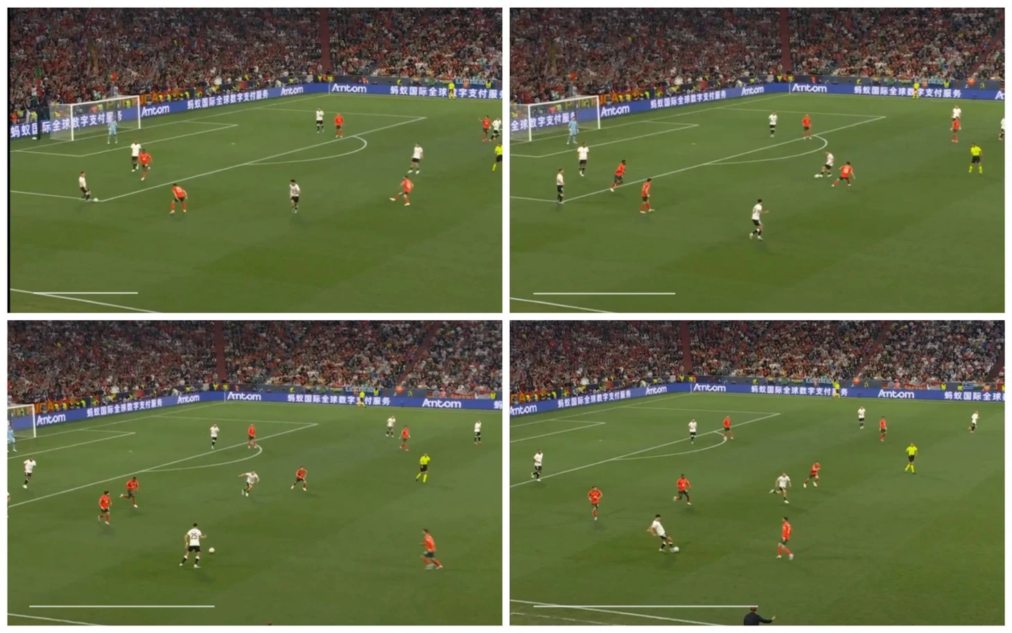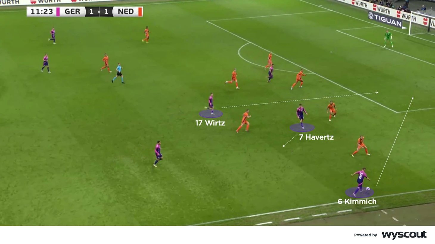 Например, в матче против Нидерландов в марте 2024 года, когда за Хаверцем последовал центральный защитник, Виртц открылся в освободившуюся зону, где его нашёл Киммих. К голу это не привело, но опаснейший момент возник благодаря умному взаимодействию между игроками и использованию пространства.