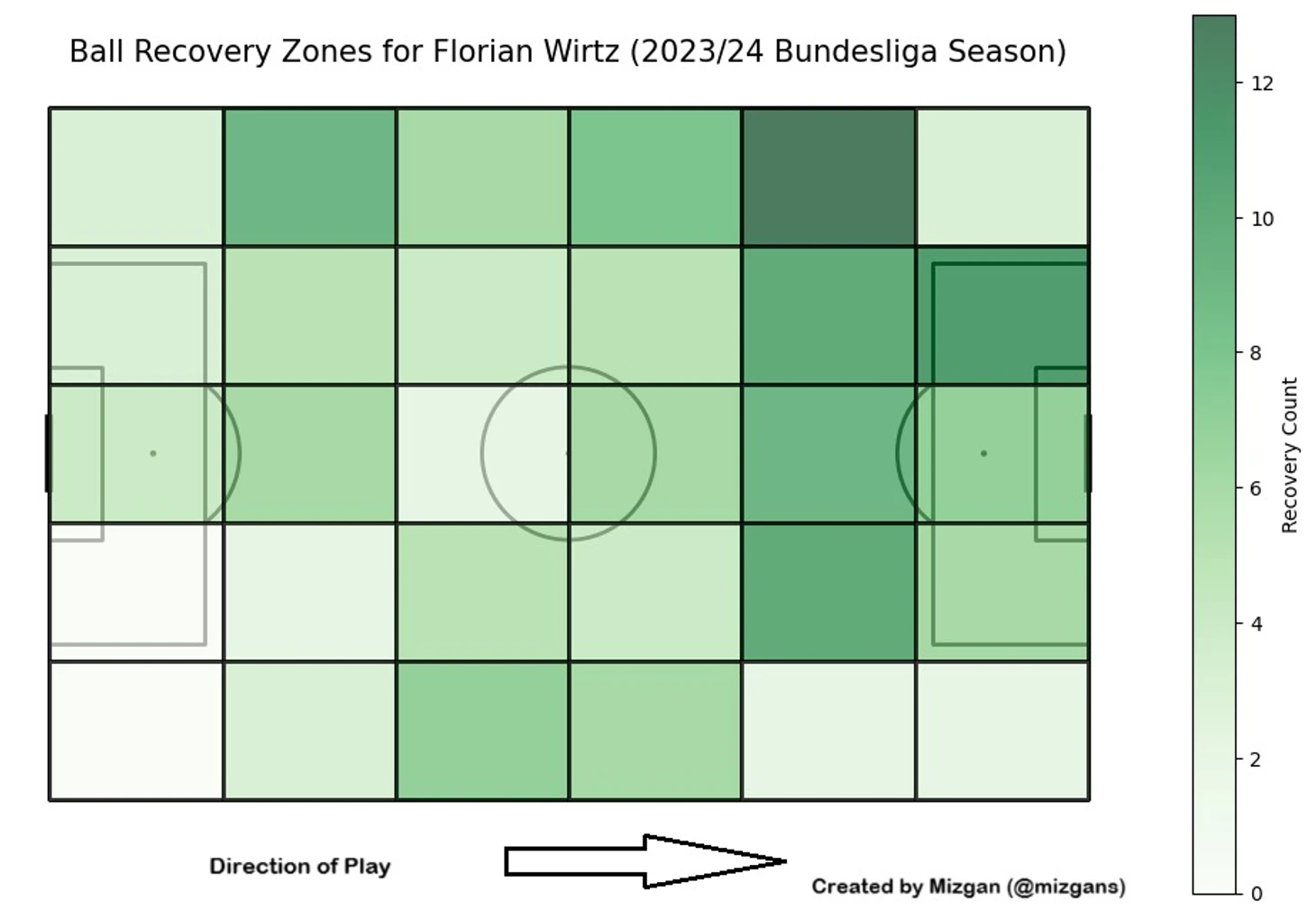 Если обратить внимание на зоны, выделенные ниже (сезон 23/24), то Виртц осуществляет возврат мяча практически по всему полю, но, в особенности, в финальной трети поля и ближе к левому флангу, где он чаще всего и выступает при контроле мяча.