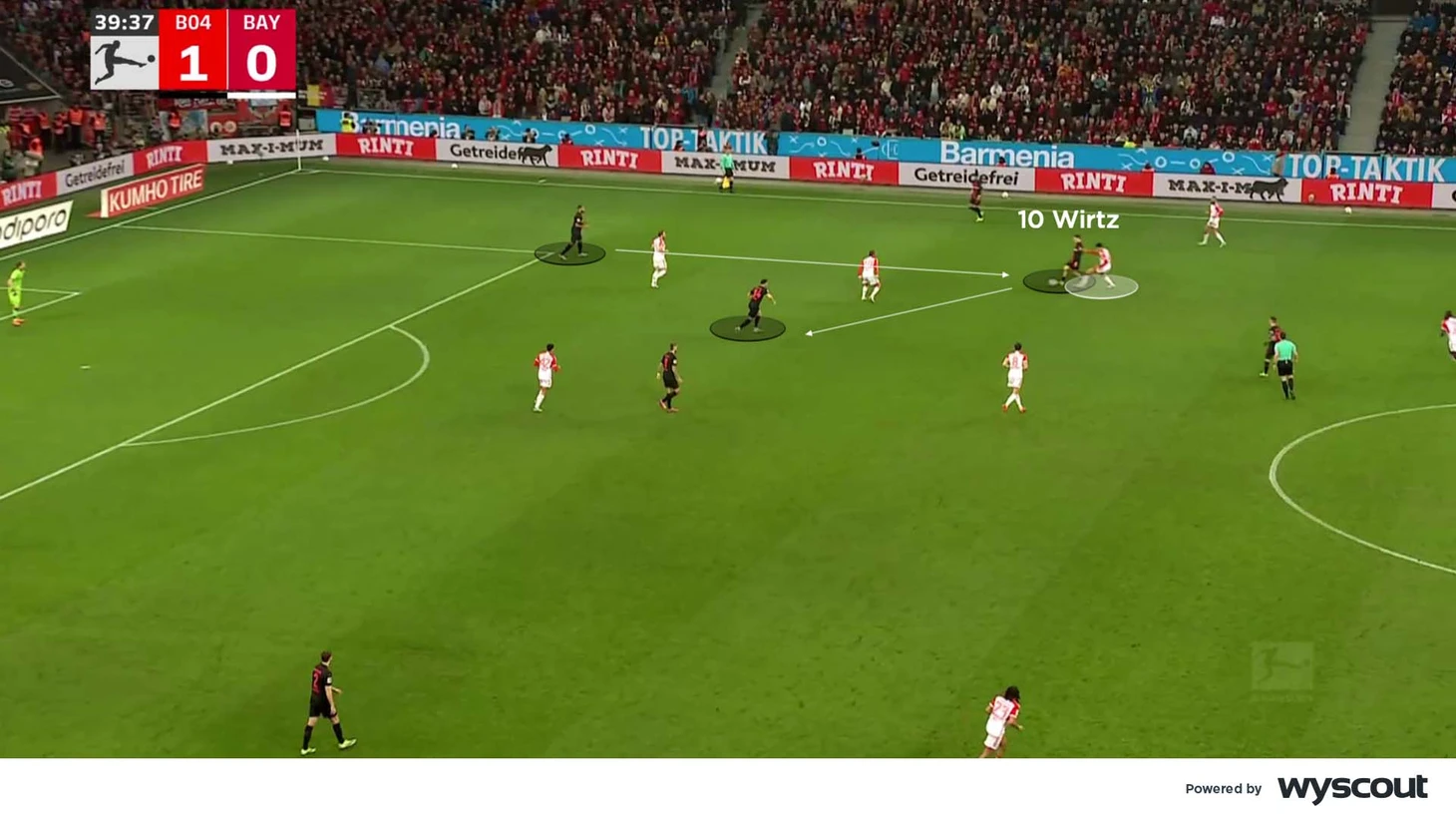 В этом примере из декабрьского домашнего матча против «Санкт-Паули» он получает мяч от Алехандро Гримальдо в своей любимой зоне поля. Виртц тут же обыгрывает защитника и забивает.