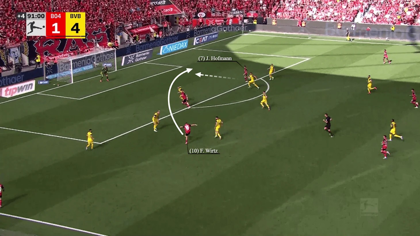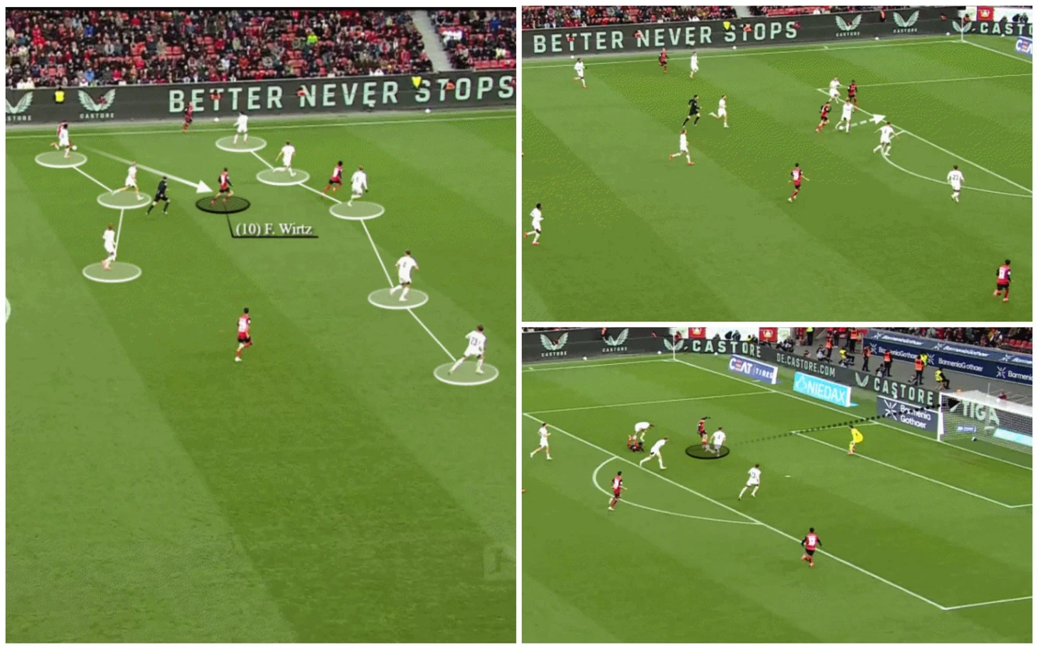 Такой настрой позволяет Виртцу находить и создавать моменты, меняющие ход игры, что и делает его игроком мирового класса. В его арсенале множество разнообразных передач, в том числе навесы внешней стороной стопы, такие как приведенный ниже против дортмундской «Боруссии»…