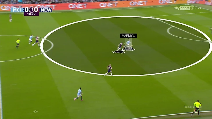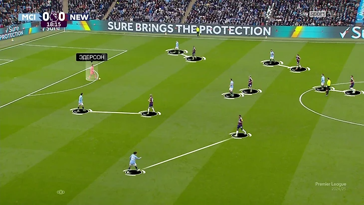 На практике выглядит примерно так. «Ньюкасл» использует персональный прессинг на чужой половине. При таком давлении все опции перекрыты, а вратарь – единственный игрок без давления. Эдерсон получат возможность продвинуться и подготовить пас.