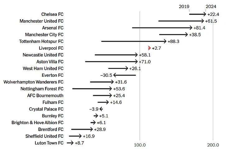 Соответственно, ежегодные расходы на амортизацию, которые несут клубы, значительно уступают аналогичным показателям по стране: в прошлом году амортизационные отчисления «Ливерпуля» в размере £114,5 млн. были на £20 млн. меньше, чем у Шпор, и на £75 млн. меньше, чем у «Челси». После спокойного лета 2024 года амортизация не будет сильно расти, если вообще будет.