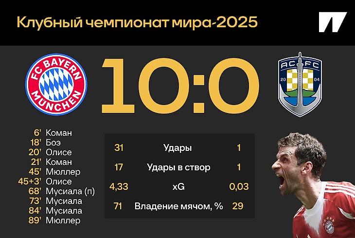 ● У Кингсли Комана дубль и голевая за 21 минуту первого тайма – запустил эти безумные 10:0. За весь сезон Бундеслиги было всего пять голов, а здесь разошелся. Коман такого не делал в одном матче с ноября 2023-го, тогда участвовал в погроме Гибралтара за сборную (тоже 2+1).