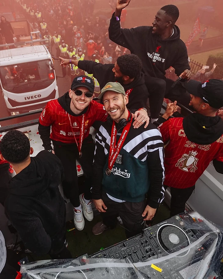 Другой герой тут – шотландский диджей и продюсер Кэлвин Харрис. Дуа Липа несколько раз говорила, что он болеет за «Ливерпуль». Более того, Кэлвин уже два раза отвечал за музыку на трофейных парадах команды – в 2022-м и 2025-м!